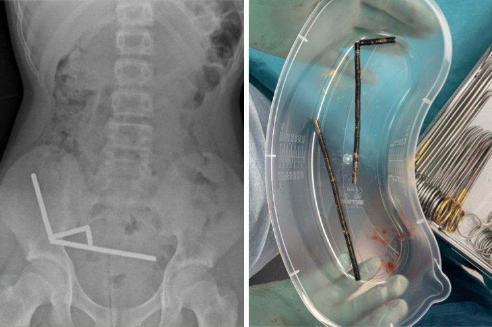 Na levi je rentgenska slika trebuha s štirimi verižnimi nizi magnetov v desnem spodnjem delu trebuha, na desni pa približno 80 do 100 močnih magnetov, odstranjenih med operacijo.