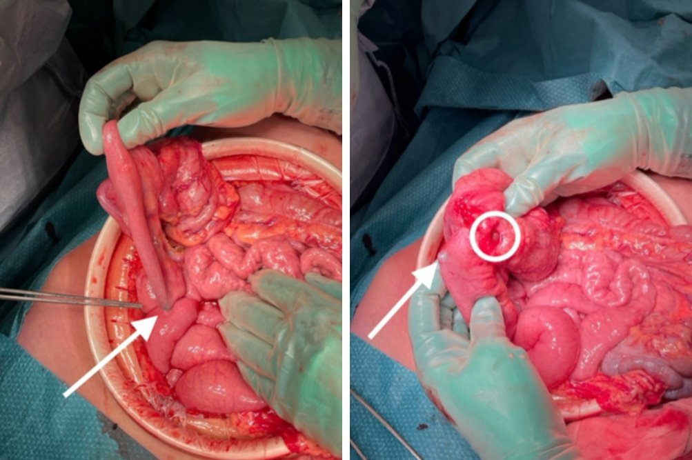 Prva slika s puščico kaže na dva dela črevesja, zlepljena zaradi magnetov. Druga slika prikazuje krog, ki označuje del slepega črevesa, kjer je zaradi pritiska prišlo do odmrtja tkiva, puščica pa kaže na verigo magnetov v spodnjem delu tankega črevesa.
