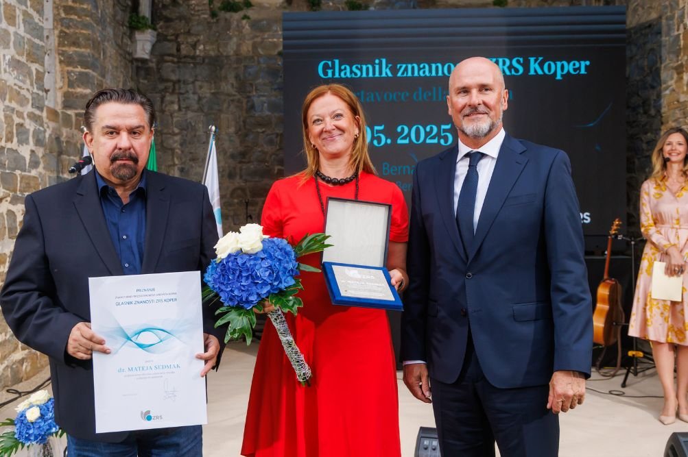 Od leve proti desni: dr. Egon Pelikan, predsednik Znanstvenega sveta ZRS Koper,dr. Mateja Sedmak, prejemnica priznanja 'Glasnik znanosti' in dr. Rado Pišot, direktor ZRS Koper.