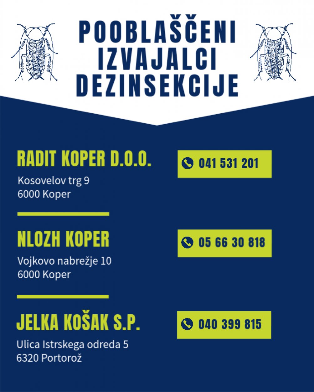 - Upravniki in gospodarski subjekti: Upravniki večstanovanjskih zgradb, lastniki gostinskih lokalov, trgovin in drugih gospodarskih objektov, ki so zakonsko dolžni opravljati redno dezinsekcijo, so vabljeni, da v tem terminu izpolnijo svoje obveznosti. Na podlagi izkušenj je zatiranje škodljivcev uspešnejše, če je dezinsekcija istočasno opravljena na celotnem območju.